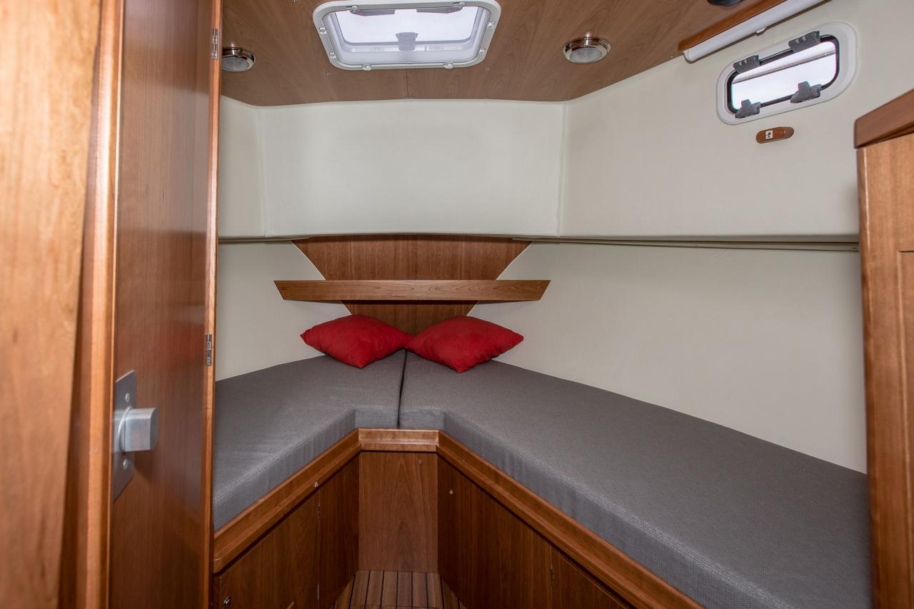 La cabine avant dispose de 2 couchettes en V, transformables en couchette double, avec de nombreux rangements et une grande penderie. Le cabinet de toilette offre un lavabo, une douche et un WC marin.